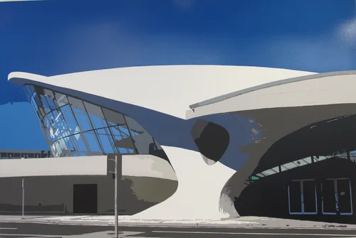 Large artwork on a gallery wall depicting a stylized architectural structure with a geometric roof supported by columns, set against a background of trees in black, white, and beige tones.