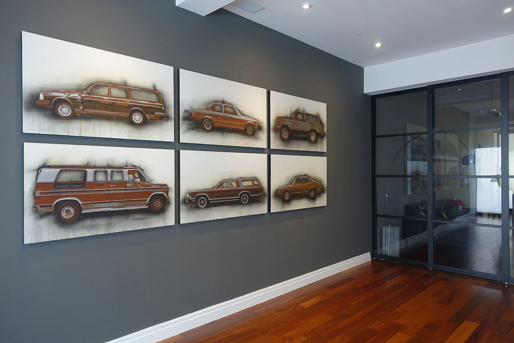 Two of the three Bike paintings 48"x48" each Rust, oil and enamel paint on steel panels. (Paintings are currently available.)